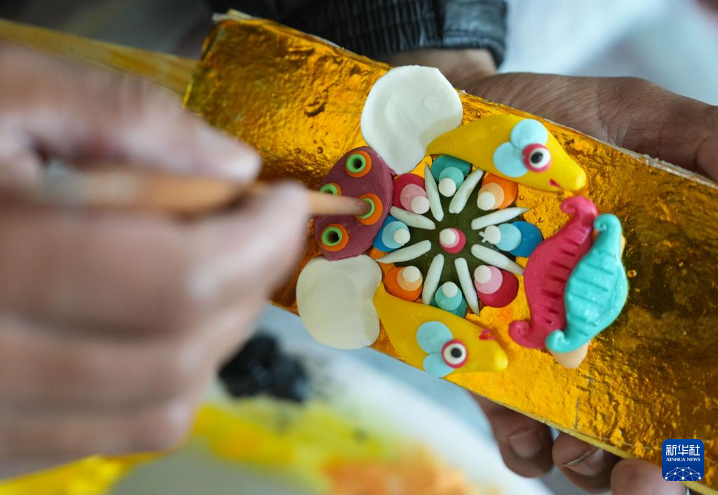 在拉薩市老城區(qū),手工藝人在展示酥油花(2月25日攝)。新華社記者 姜帆 攝