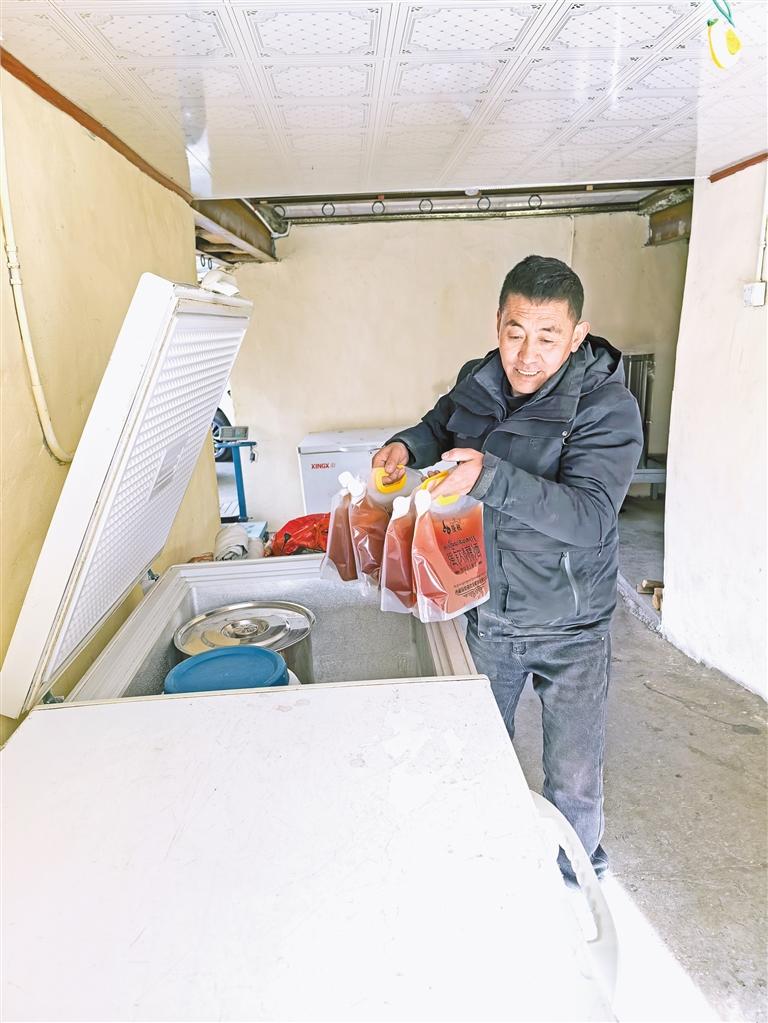 洛桑多吉從冰柜中取出自釀的“強欽青稞酒”。