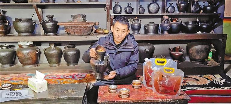 洛桑多吉在自家工坊內(nèi)品嘗自釀的“強欽青稞酒”。 圖/文 記者 王超 見習(xí)記者 土旦仁青