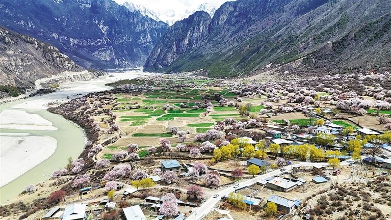 4月的那曲市嘉黎縣尼屋鄉(xiāng),春雪初融、桃花灼灼,村落、農(nóng)田與桃花融為一體,呈現(xiàn)出一派高原和美鄉(xiāng)村景象。