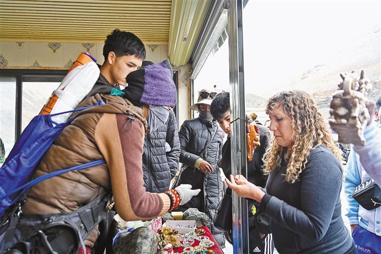 新奇感過后,游客們開啟購物模式?!鞍⒓眩@個掛飾可以定制嗎?”“你們可以發(fā)快遞嗎?”對于一連串的問題,阿佳格桑忙碌地一一回答著,“你們想要什么圖形,我們就給你定制什么圖形?!薄拔覀冞@兒快遞很快,今天下單明天就給你發(fā)!”短短半個小時,“阿佳格桑工坊”的生意火爆,銷售藏式靠墊、藏式地毯、掛飾等特色產(chǎn)品4000多元?!盎厝ズ?,我要通過自媒體平臺,宣傳這次西藏之旅的所見所聞,讓更多親朋好友來西藏旅游!”日本游客琴音有感而發(fā)。