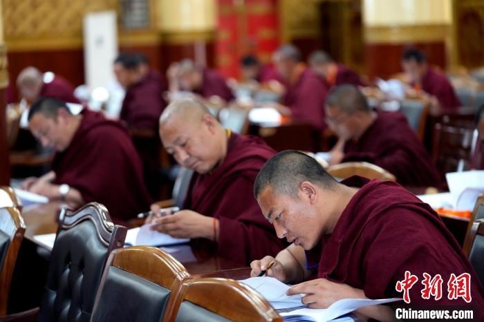 圖為5月30日,中國藏語系高級佛學院2025級高級學銜班招生考試在西藏拉薩考點舉行通識知識考試。中新社記者 李林 攝