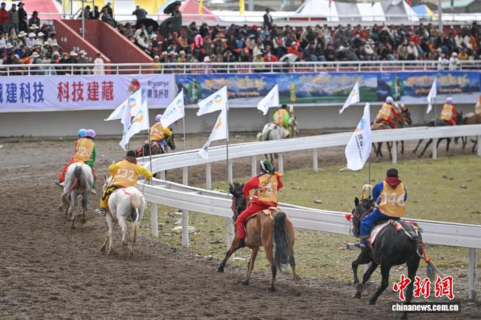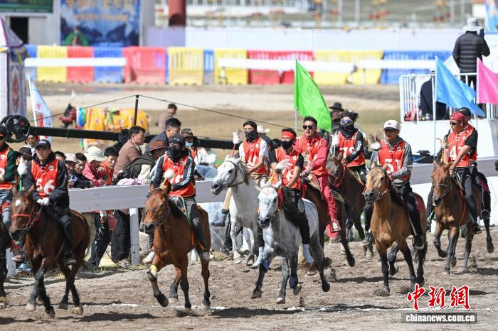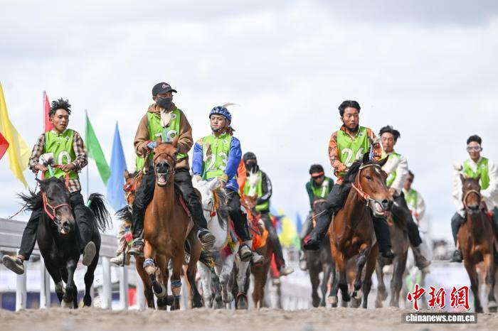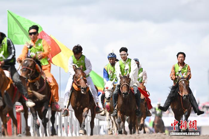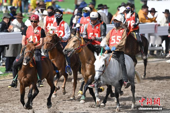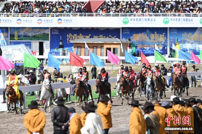 9月6日,西藏自治區(qū)那曲市恰青賽馬節(jié)進(jìn)入第二天,格薩爾賽馬場(chǎng)賽事精彩不斷。場(chǎng)內(nèi),1.38米以下小馬展開(kāi)10000米速跑、10000米走馬、12000米走馬決賽,1.38米以上1.45米以下大馬角逐10000米速跑決賽。為觀眾帶來(lái)速度與耐力的草原盛宴,盡顯藏北草原賽馬文化的獨(dú)特魅力。圖為1.38米以上1.45米以下大馬速度賽比賽現(xiàn)場(chǎng)。中新社記者 貢嘎來(lái)松 攝