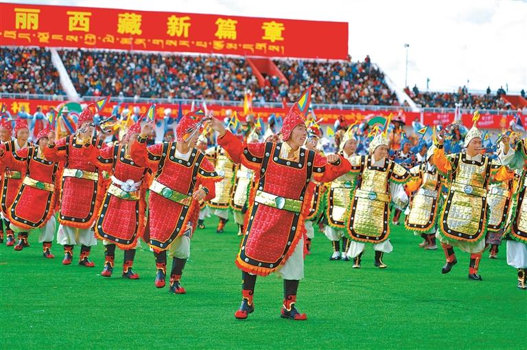 來自四川、青海及西藏本地的馬術(shù)隊英姿颯爽,躍馬揚鞭;千人共舞《禮贊甲子》,舞步豪邁,衣袂飛揚,再現(xiàn)西藏六十年的滄桑巨變;器樂合奏《風(fēng)從浙江來·樂在那曲揚》則巧妙融合江南韻律與草原風(fēng)情,奏響對口支援的深情厚誼;《馱鹽之歌》悠揚響起,仿佛將人們帶回了古老的歲月,展現(xiàn)了高原兒女堅韌不拔的精神……賽馬場核心區(qū)域,傳統(tǒng)馬術(shù)與現(xiàn)代藝術(shù)在這里交相輝映,引來掌聲如潮、喝彩不絕。