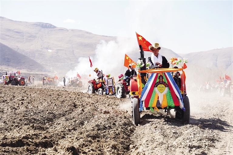 春耕儀式開始之前,犁手們依次吃糌粑、敬青稞酒、煨桑、獻(xiàn)哈達(dá),每個人臉上都流露著幸福的笑容?!拌F?!眰冊谔镩g一字排開,浩浩蕩蕩駛進(jìn)農(nóng)田,后面跟著盛裝打扮的姑娘,她們手持種子、肥料撒入農(nóng)田。這是來自春天的希望,希望秋收滿倉。