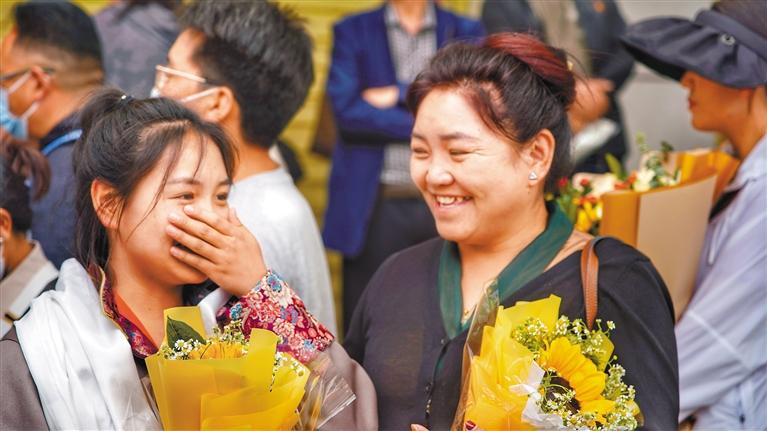 圖為家長為結(jié)束高考的考生送上鮮花。 記者 平措次仁 攝