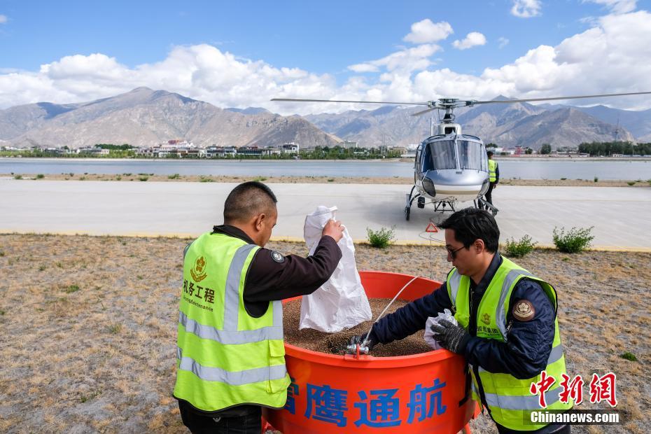 6月9日,西藏拉薩,拉薩雪鷹通航直升機(jī)從機(jī)場(chǎng)起飛前往造林點(diǎn)。當(dāng)日,西藏自治區(qū)林業(yè)和草原局在拉薩市組織開(kāi)展首次飛播造林工作,此次飛播造林共設(shè)計(jì)9個(gè)飛播作業(yè)區(qū),其中拉薩市7個(gè),山南市2個(gè),由拉薩雪鷹通用航空公司負(fù)責(zé)飛機(jī)播種。設(shè)計(jì)飛播造林面積21.8萬(wàn)畝,設(shè)計(jì)飛機(jī)播種沙棘、砂生槐等樹(shù)(草)種約119.3噸。中新社記者 何蓬磊 攝