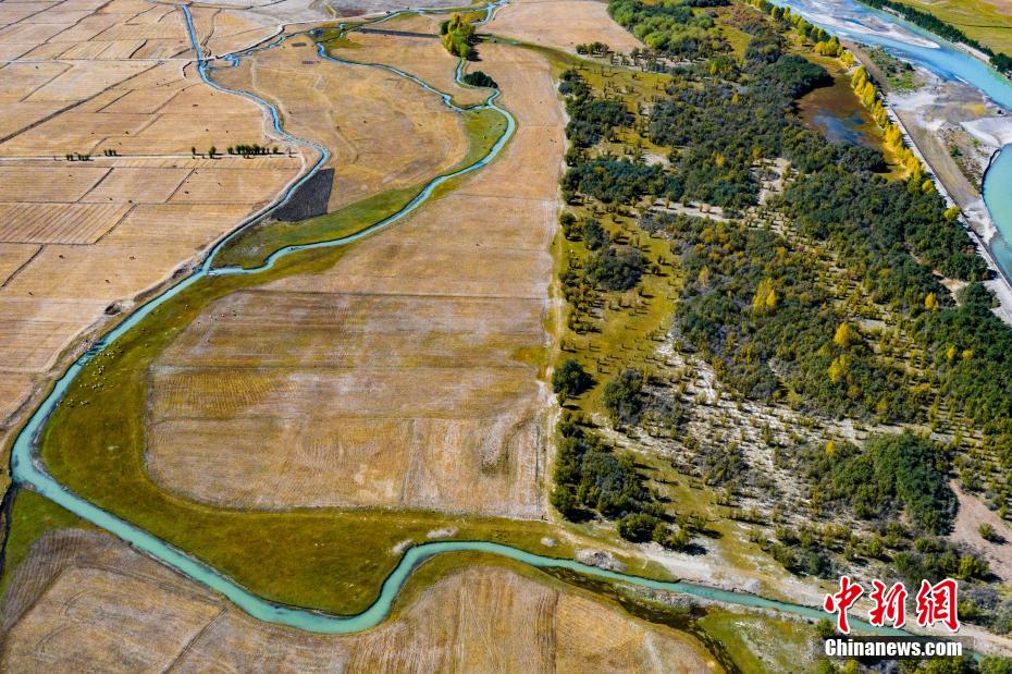 日喀則江孜縣境內(nèi)農(nóng)田、村居與金黃的樹林相映成趣。 何蓬磊 攝