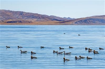 羊卓雍錯自2014年被納入國家良好湖泊生態(tài)環(huán)境保護(hù)試點(diǎn)工程項(xiàng)目以來,羊卓雍錯周邊生態(tài)環(huán)境持續(xù)向好,棲息繁衍的野生動物數(shù)量逐年增多。這是近日拍攝的羊卓雍錯湖面上的水鳥。新華社記者 孫非 攝