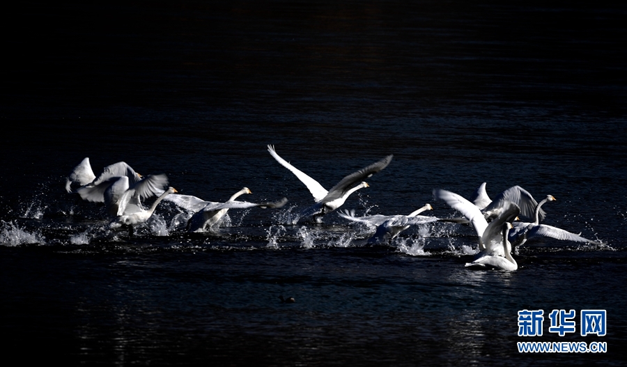 一群天鵝在位于青海省海南藏族自治州的千姿湖嬉戲。新華網(wǎng) 潘彬彬 攝