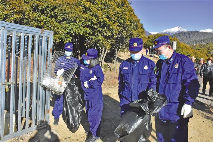 圖為林芝市消防救援支隊市區(qū)指戰(zhàn)員在清理生活垃圾。米次 攝