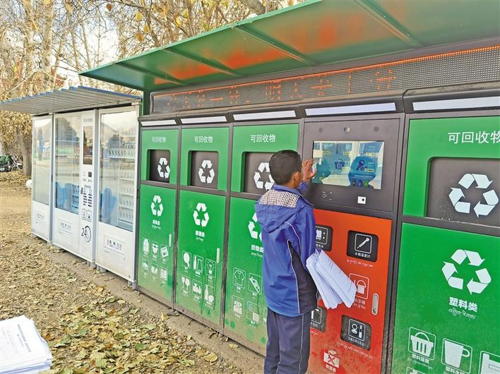 記者在林周縣城部分小區(qū)和學(xué)校內(nèi)看到,安裝的智能垃圾分類設(shè)備已全部投入使用,智能分類回收箱箱體上標(biāo)注著“紙張”“塑料”“金屬”等各類名稱。學(xué)生們只要在設(shè)備端口掃描校園班級(jí)卡上的二維碼,把廢紙、塑料瓶等垃圾依次分類放入“智能回收箱”,垃圾分類箱便會(huì)根據(jù)投放的垃圾自動(dòng)稱重計(jì)算積分,并在學(xué)生的校園班級(jí)卡賬戶上增加相應(yīng)的“垃圾兌換積分”,使用積分就可以在平臺(tái)兌換作業(yè)本、紙筆等學(xué)習(xí)用品。
