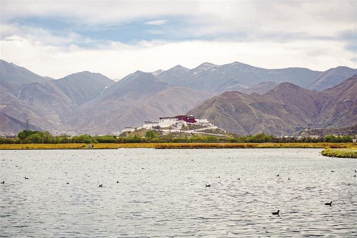 從拉薩市當(dāng)熱西路上向北望去,便能看到這塊北面靠山,東、南、西三面為市區(qū)包圍,面積12.2平方公里的濕地。遠(yuǎn)處,連綿起伏的山頂還覆蓋著薄薄的積雪,布達(dá)拉宮雄偉而秀美;近處,濕地內(nèi)隨意顯現(xiàn)出的一塊塊水泊,成群的候鳥在水中玩耍嬉戲、在藍(lán)天白云下飛舞。拾階過(guò)橋,一條木質(zhì)長(zhǎng)廊向濕地中延伸,只是我們這些不速之客的到來(lái),驚起水鳥無(wú)數(shù)。它們仿佛商量好似的沖上藍(lán)天,讓人為打擾它們的棲息而不安。