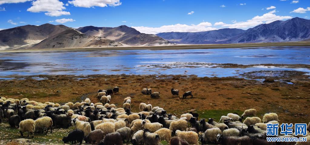 羊群經(jīng)過西藏定結縣一處湖邊的草地(5月13日攝,手機照片)。新華社記者 沈虹冰 攝