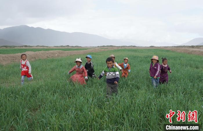 在綠麥草草場(chǎng)上玩耍的藏族兒童。 潘旭臨 攝