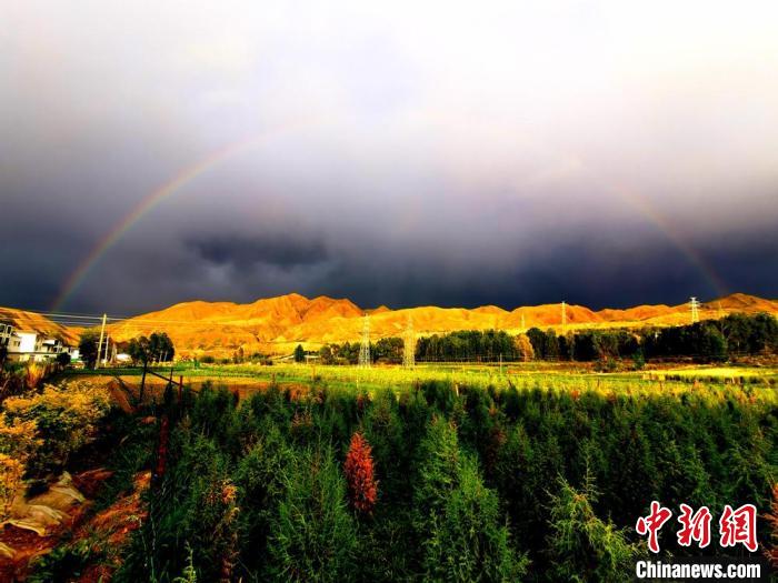 2019年月初,甘肅張掖市肅南裕固族自治縣祁連山下草原千里花開、萬里綠海。圖為雨后彩虹。(資料圖) 武雪峰 攝