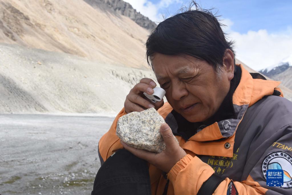8月30日,在西藏日喀則市定日縣,中科院地理科學與資源研究所客座教授李渝生使用放大鏡觀察巖石。新華社記者 杜剛 攝