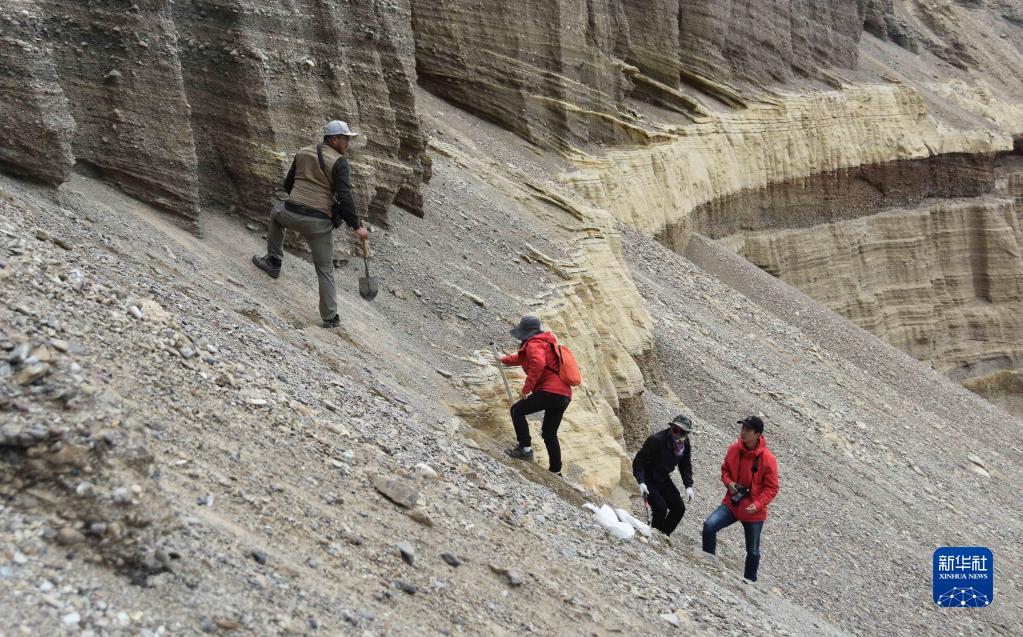 8月27日,科考隊員在西藏日喀則市定結縣一個垂直地面的沉積剖面工作。新華社記者 杜剛 攝
