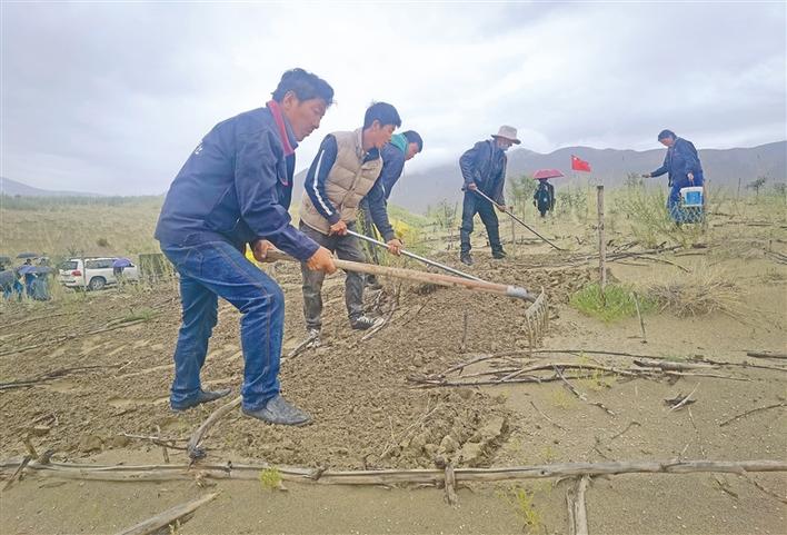 圖為農(nóng)牧民群眾在山南市全國(guó)防沙治沙綜合示范區(qū)的沙地上種草。記者 史金茹 攝