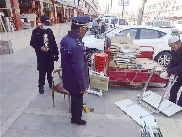 執(zhí)法人員對占道經(jīng)營商戶進行勸說。圖由城關(guān)區(qū)城管局提供