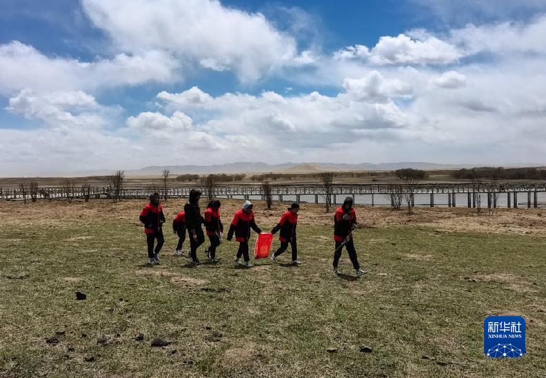 學(xué)校學(xué)生到九曲黃河第一彎清理白色垃圾。(唐克九年一貫制學(xué)校供圖)