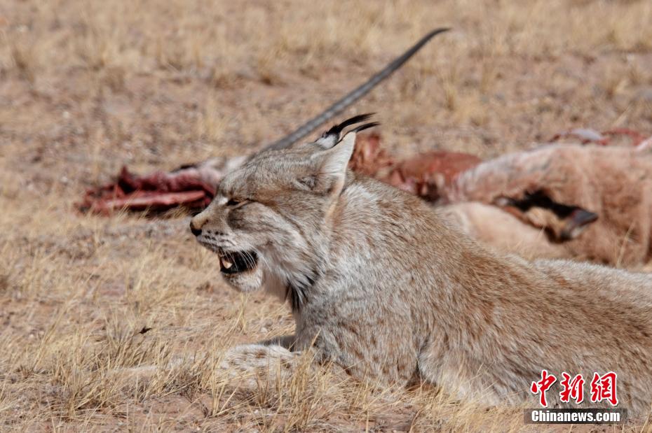 圖為猞猁臥在獵物藏羚羊身旁。 卓瑪加 攝