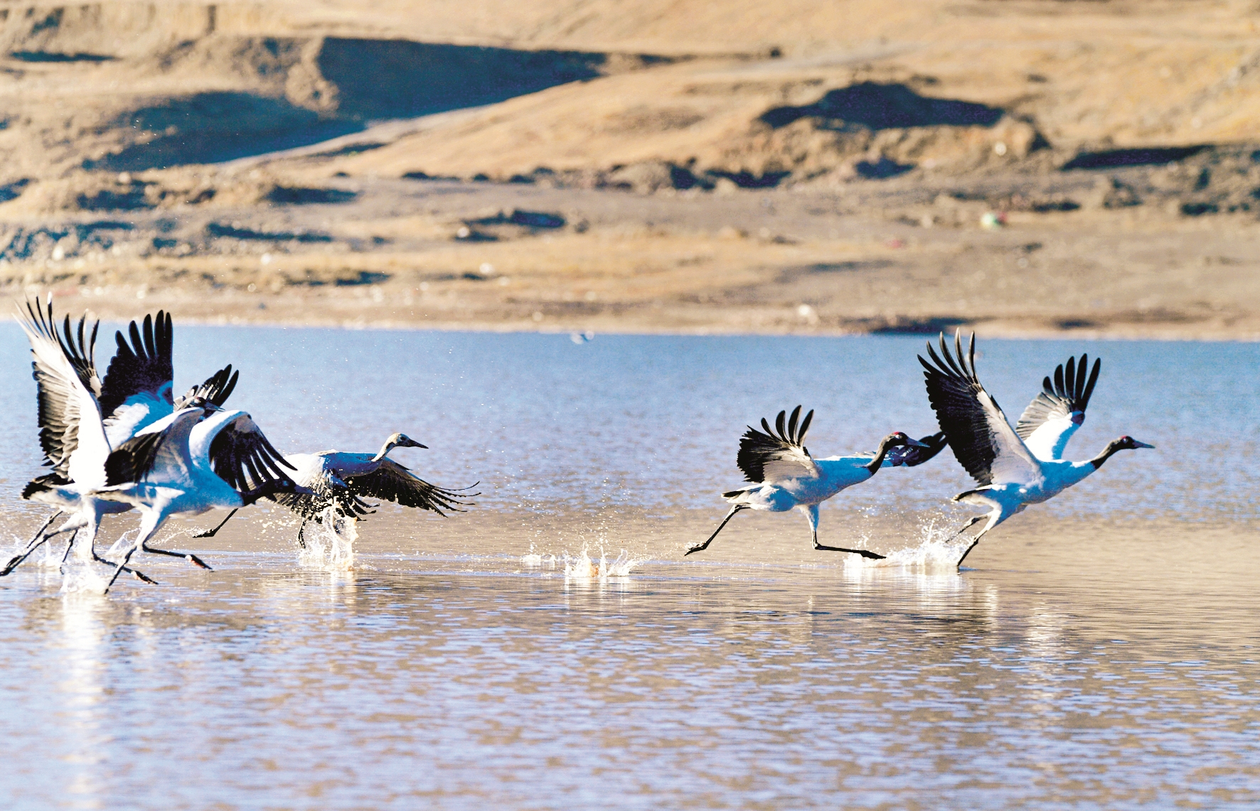 這是在林周縣虎頭山水庫拍攝的黑頸鶴(12月7日攝)。(新華社發(fā))
