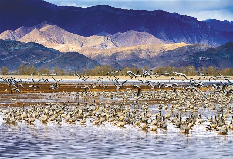 圖為在拉薩河谷越冬棲息的斑頭雁群落。記者 格桑吉美 攝