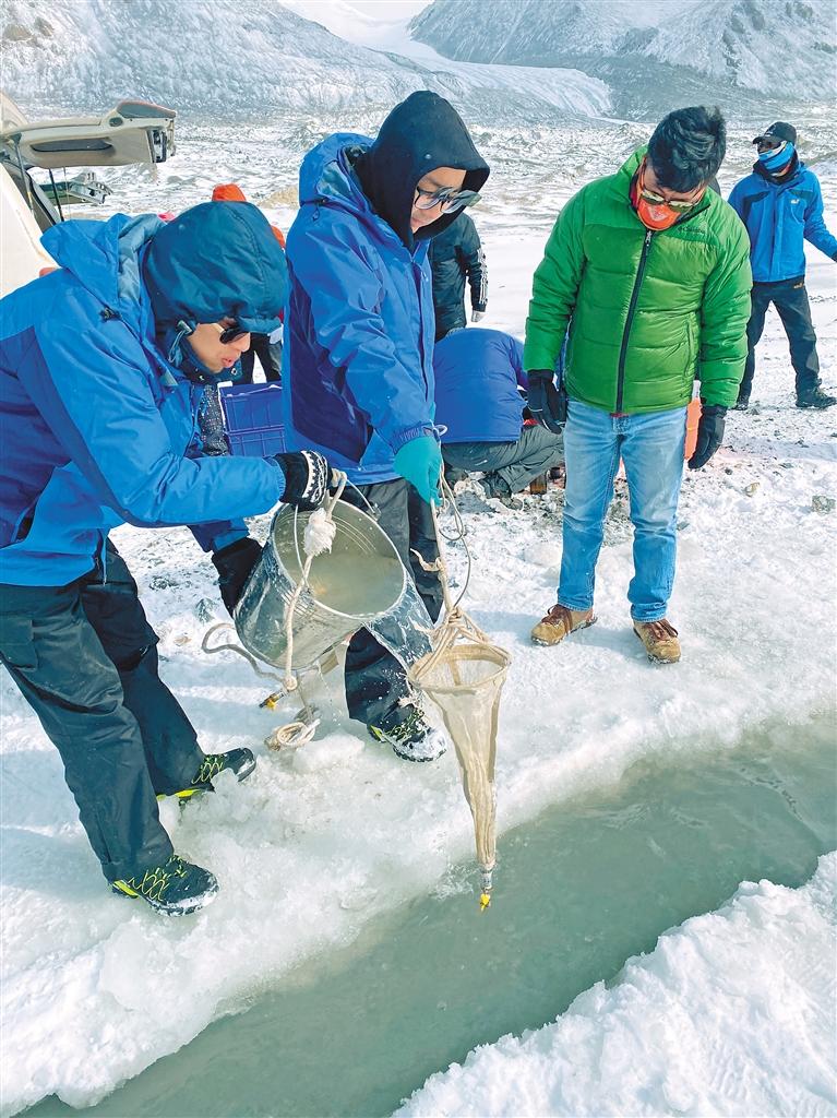 在姜根迪如冰川前的河道采取水生物樣本時,于愛琛要鑿開近10厘米的冰面,冰渣子進入收集網(wǎng)里,又要用手取出來。即使戴著手套,刺骨的水溫也能通過手指使寒意襲遍全身,他整個手臂如同電量快耗盡的機器,緩慢機械地進行著工作。但由于氣溫太低,沾了水的收集網(wǎng)很快又會被凍住,為了抓緊時間將樣本裝入瓶中,于愛琛索性取下手套,用開水將結冰的收集網(wǎng)融化,這一冷一熱間,整雙手早已麻木。當時,于愛琛整個臉都是發(fā)腫鐵青的,紫黑色的嘴唇完全爆皮,說話時血從嘴唇皸裂處流出也不自知。