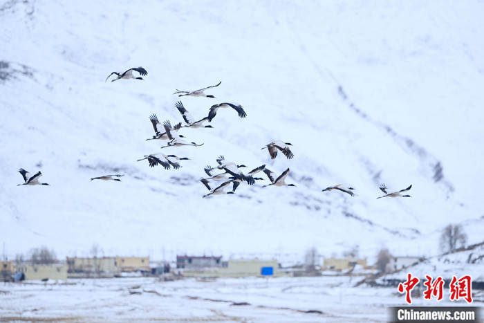 圖為2月23日,西藏林周縣虎頭山水庫附近村莊上空,一群黑頸鶴飛過,遠(yuǎn)處白雪皚皚。 中新社記者 江飛波 攝