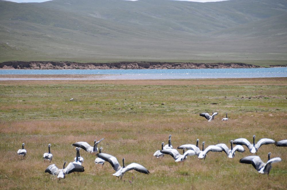 2020年8月19日,在三江源國(guó)家公園黃河源園區(qū)內(nèi),一群斑頭雁在黃河邊草地上翩然起飛。新華社記者 呂雪莉 攝