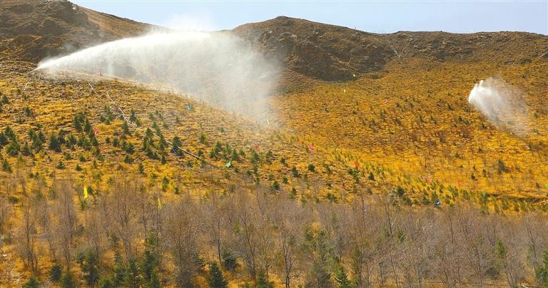 圖為拉薩南北山綠化工程的自動智能澆水系統(tǒng)在給寶瓶山樹林澆水。 記者 格桑倫珠 實習生 達娃宗巴 攝