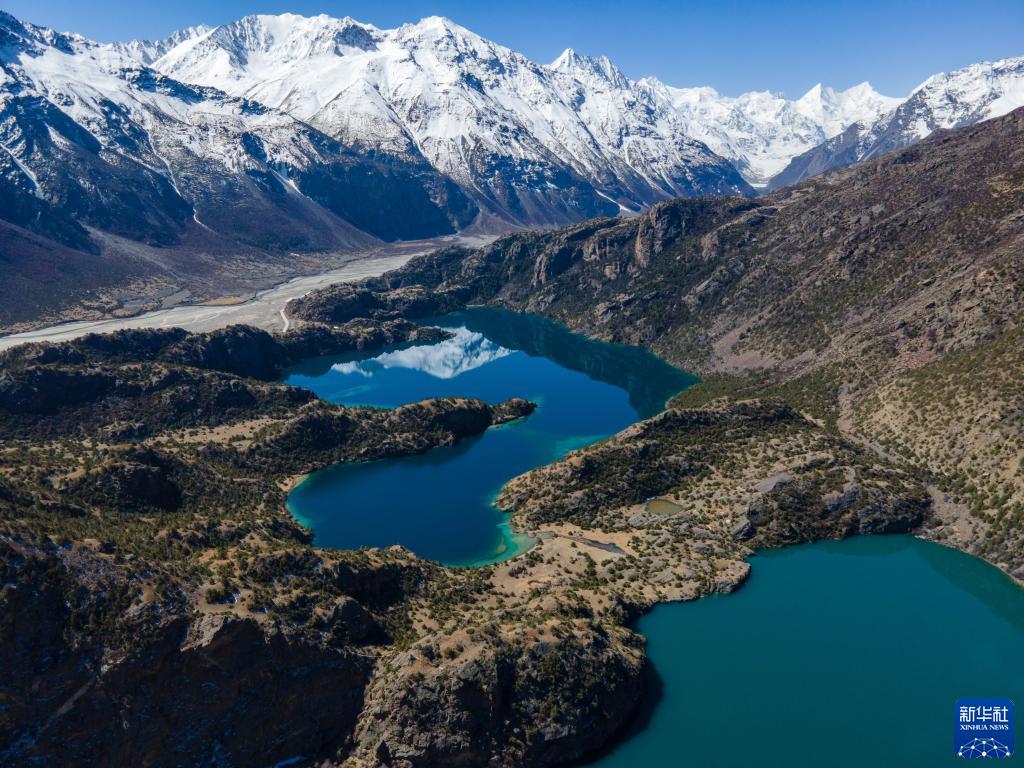 黑湖映射出雪山的倒影(4月2日攝,無人機(jī)照片)。新華社記者 周荻瀟 攝