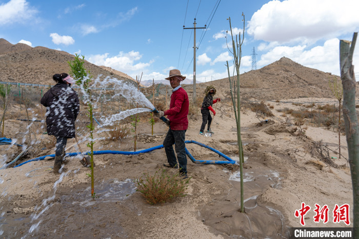 4月還是西藏的植樹季。記者沿雅魯藏布江而上,在桑耶寺上游十余公里處,松卡村十余位農(nóng)牧民正在一片荒灘上挖坑、栽種楊樹、澆水?!斑@個地方去年就開始種樹了,沙地種樹太難,一些樹沒有成活,今年再補種?!必?fù)責(zé)澆水的扎西杰布說,該荒灘被一家綠化公司承包,他們是受雇于公司。