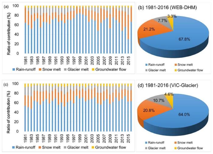 王磊表示,依托監(jiān)測網(wǎng)絡(luò)和其他多源數(shù)據(jù),研究團(tuán)隊生成了1981-2019年這38年內(nèi)雅魯藏布江流域高時空分辨率降水?dāng)?shù)據(jù),在此基礎(chǔ)上進(jìn)一步通過對比、綜合主流冰凍圈水文模型的徑流組分模擬,研究得出的結(jié)果顯示,雅魯藏布江流域(奴下水文站以上)新的降雨、融雪、冰川融化和地下水補(bǔ)給分別占總徑流的66%、21%、9%和4%。