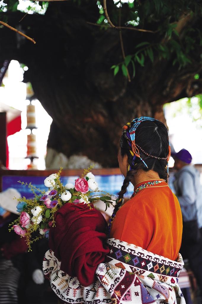 走在熙熙攘攘的八廓街,古樹已經(jīng)枝繁葉茂,陽光很難穿透密集的葉子,只能勉強(qiáng)擠出幾束光,碎落在古樹下乘涼的老人腳下。樹下拍照的游客自成一道風(fēng)景,享受著高原夏日的美好時光。