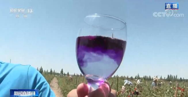 除了紅枸杞之外,這里還種植了15000多畝的有機(jī)黑枸杞,黑枸杞的成熟時間要遲一些,在8月下旬,所以我現(xiàn)在手里只有黑枸杞干。大家可以看一看,如果我們把它也像紅枸杞一樣泡入水中的話,顏色展開得非??欤瑤酌腌姷臅r間水就已經(jīng)是藍(lán)紫色了。當(dāng)?shù)氐呢?fù)責(zé)人告訴我,這很大程度是因為它的花青素含量高,所以黑枸杞也有另外一個名字,叫作“花青素之王”。