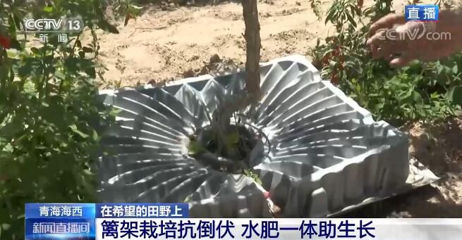 在栽培種植方面,由于枸杞樹苗比較脆弱,為了保證存活率,需要在溫室里培育一定時間才能適應(yīng)這里的氣候,之后才會移植到室外,進(jìn)行籬架栽培。而這樣的種植方式主要是為了抗倒伏,這里風(fēng)沙天氣較為頻繁,如果沒有籬架的支持保護(hù),枸杞樹很容易會栽倒,結(jié)下的果子與地表接觸一段時間后基本就會糜爛,產(chǎn)量就無法保證。大家可以再看一下枸杞樹的底部,有一個黑色的水管,工人會在水里加入水溶肥,既能澆水又能施肥,達(dá)到水肥一體。底下灰色的托板有兩個好處,一個是精準(zhǔn)灌溉,因為在高海拔地區(qū)氣候比較干燥、降水比較少,板上的凹槽能夠?qū)⒂晁吐端紖R聚到枸杞樹;第二個是可以遮擋陽光,能夠抑制雜草的生長。