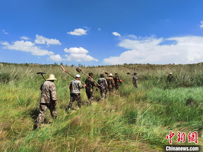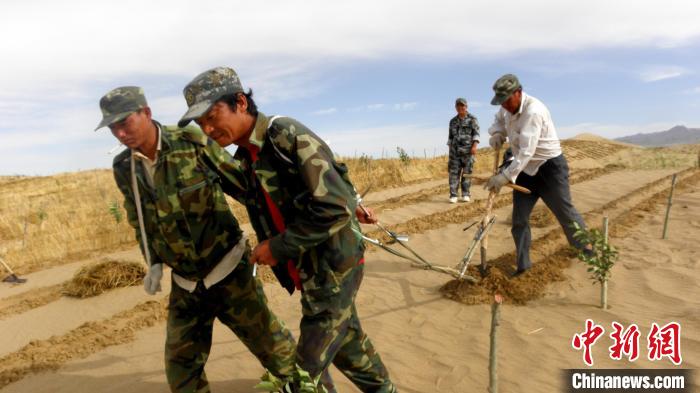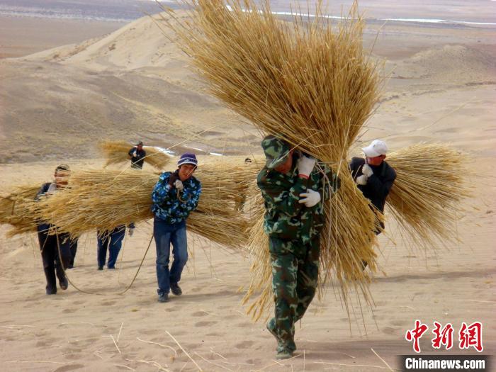 資料圖為固沙工程人工運(yùn)草?!跆m縣委宣傳部供圖