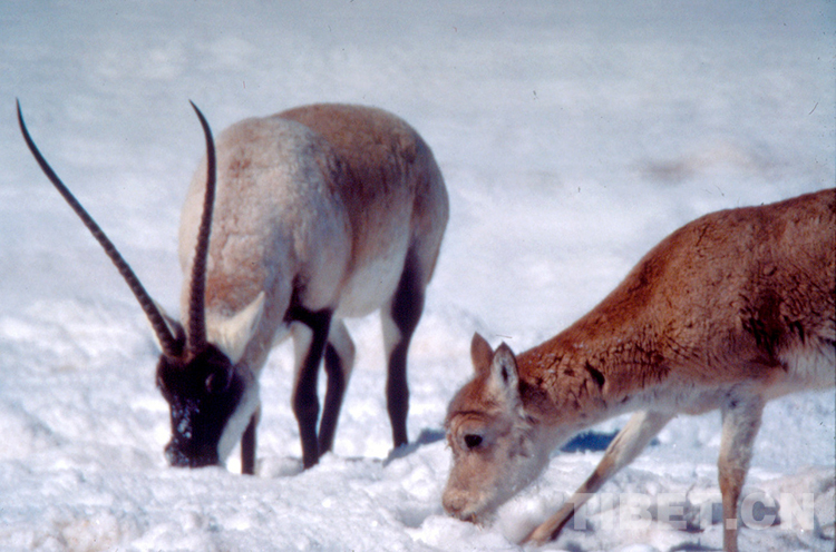 這是一對在羌塘國家級自然保護區(qū)雪地里覓食的國家一級保護動物藏羚羊(唐召明提供,2007年6月21日攝)