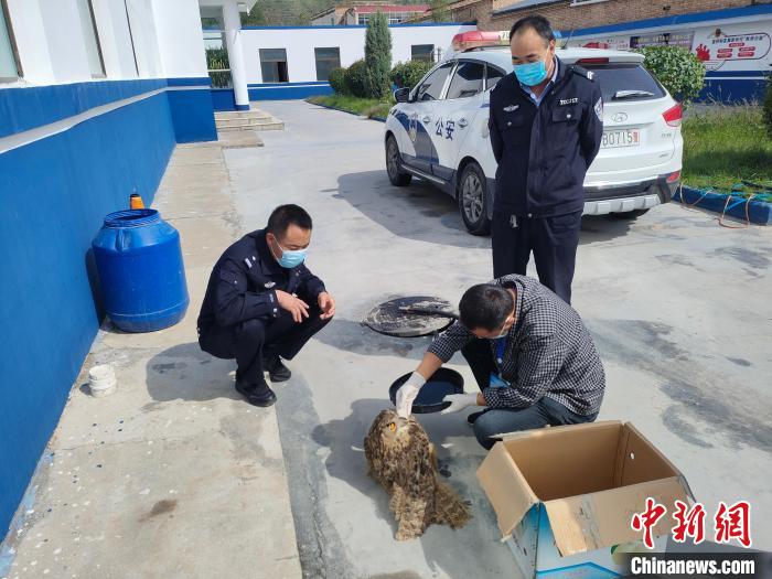 圖為互助縣野生動(dòng)物保護(hù)管理部門工作人員正在檢查國家二級(jí)保護(hù)野生動(dòng)物雕鸮受傷情況。 互助公安供圖