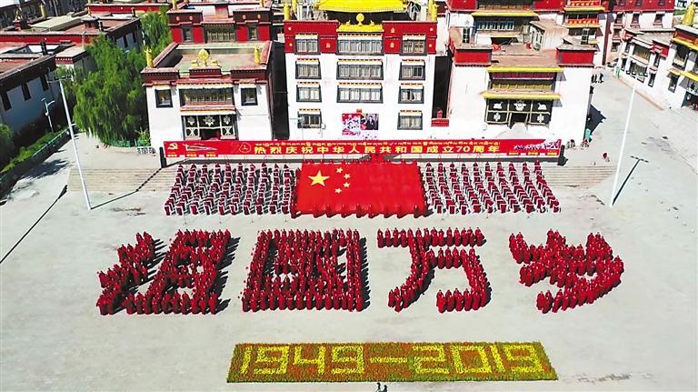 引導(dǎo)宗教界人士爭做愛黨愛國愛人民、堅(jiān)決維護(hù)祖國統(tǒng)一和民族團(tuán)結(jié)的模范。圖為2019年10月1日,西藏自治區(qū)昌都強(qiáng)巴林寺僧人以自己的方式表達(dá)對(duì)中華人民共和國成立70周年的祝福。