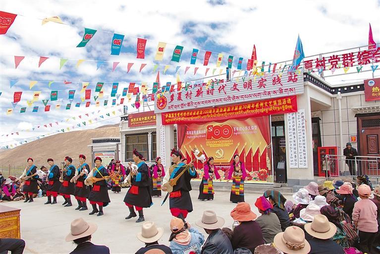 2021年7月2日,西藏自治區(qū)薩迦縣多夏村村民在新時(shí)代文明實(shí)踐站參加慶祝中國共產(chǎn)黨成立100周年和西藏和平解放70周年活動(dòng)。