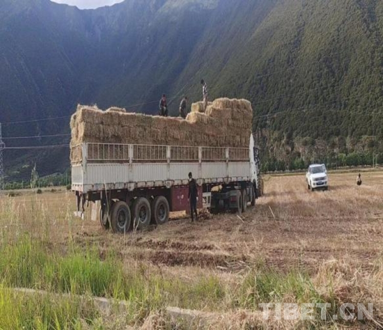 圖為國家牧草產(chǎn)業(yè)技術(shù)體系拉薩綜合試驗(yàn)站工布江達(dá)縣示范點(diǎn)秋收搶收(海拔3990米)打捆裝車的牧草