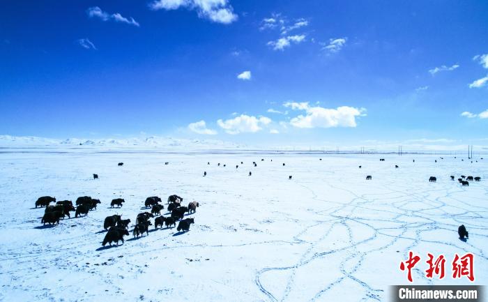 圖為黃河源頭瑪多,牦牛群在雪地中覓食?!∑罹w龍 攝