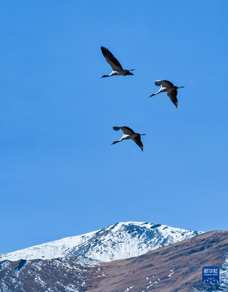 黑頸鶴在林周縣強(qiáng)嘎鄉(xiāng)上空飛翔(11月6日攝)。新華社記者 周荻瀟 攝