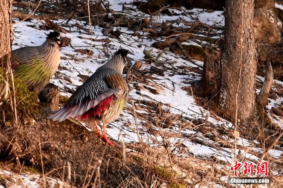 高原初冬,在位于祁連山國家公園青海片區(qū)的海北州門源縣,寺溝管護站管護員在日常巡護途中,拍攝到幾只國家二級保護動物血雉在林間悠閑覓食的珍貴影像。血雉是高寒山地森林及灌叢雉類,棲息于雪線附近的高山針葉林、混交林及杜鵑灌叢中,海拔高度多在1700-3000米,主要分布于中國,系中國特有物種。血雉素有高原“顏值擔當”物種之稱,血雉外形似眼戴太陽鏡、腳著紅色小靴,行進跳躍間時不時以喙梳理“漸變色”羽毛?;顒訒r常有雄鳥擔任警衛(wèi),遇危險時擔任警衛(wèi)的雄鳥常發(fā)出急促的“si”聲,其余個體聞聲后立刻鉆入林下草叢或灌叢中隱蔽。圖為血雉梳理羽毛。王國忠 攝