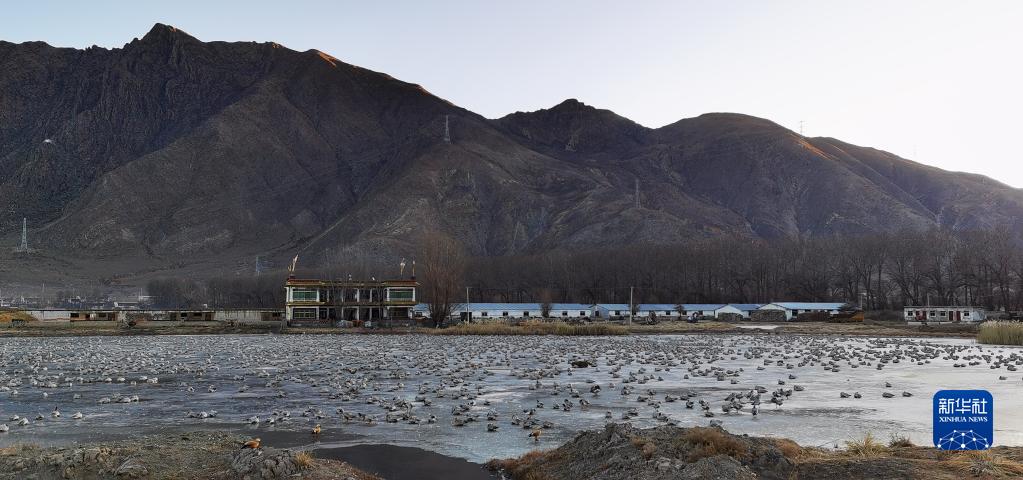 拉薩市林周縣邊交林鄉(xiāng)的池塘里,大量斑頭雁、赤麻鴨等候鳥(niǎo)棲息(12月24日攝,手機(jī)照片)。新華社記者 沈虹冰 攝
