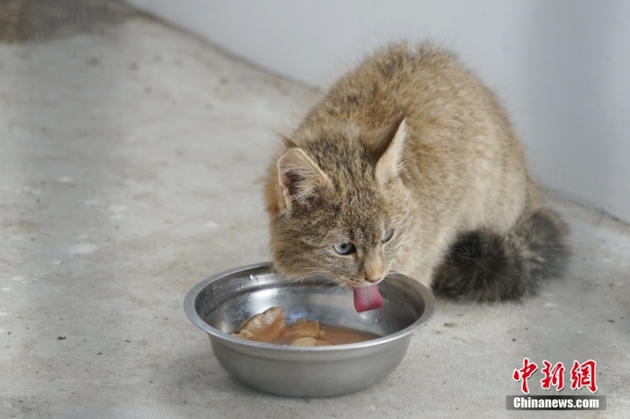 圖為1月18日,在青海省祁連山國家公園野生動物救護繁育站內,一只荒漠貓正在進食。 中新社記者 馬銘言 攝