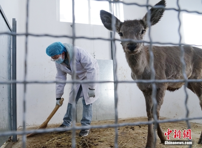 圖為1月18日,青海省祁連山國家公園野生動物救護繁育站工作人員徐豐奕正在打掃西藏馬鹿的籠舍。 中新社記者 馬銘言 攝
